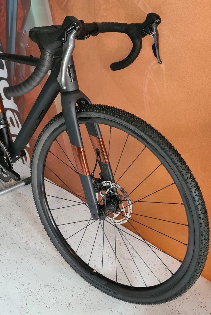 - Neumático delantero: Schwalbe G-One Bite Performance 700x40C.