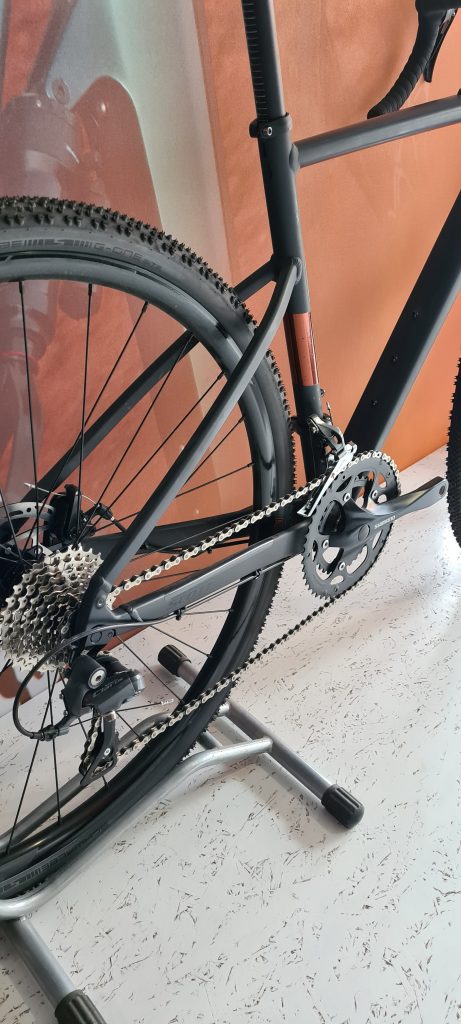 - Neumático trasero: Schwalbe G-One Bite Performance 700x40C.